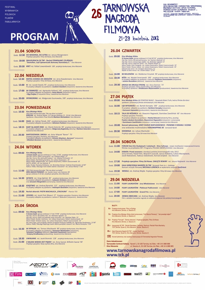 Przedsprzedaż biletów na poszczególne imprezy 26 Tarnowskiej Nagrody Filmowej rusza od 16 kwietnia 2012 r.